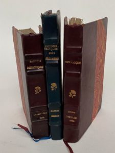 [DOCUMENTATION - FAÏENCE - CÉRAMIQUE] - Ensemble de 3 volumes : GRESLOU (Jules) - Recherches sur la céramique suivies de marques et monogrammes des différentes fabriques - Chartres ; Petrot-Garnier, 1864 - 1 volume In-8° - Marques en couleurs in texte - Reliure amateur XXe siècle demi-basane prune à coins - Couvertures conservées - Dos à nerfs orné, titré et daté or (coiffe supérieure frottée) - CHAMPFLEURY - Histoire des faïences patriotiques sous la Révolution - Paris ; E. Dentu, 1875 - 1 volume grand In-12° - 83 figures et marques gravées in et hors texte - Reliure amateur XXe siècle demi-basane prune à coins - Couvertures conservées - Dos à nerfs orné, titré et daté or - MIGEON (Gaston) - Musée National du Louvre. Catalogue des faïences françaises et des grès allemands - Paris ; Librairies-Imprimeries Réunies, sans date - 1 volume In-8° - 32 planches photographiques hors texte in fine - Reliure amateur XXe siècle demi-basane marine à coins (légèrement frottée) - Couvertures conservées (petits manques aux contours) - Dos à nerfs orné et titré or.