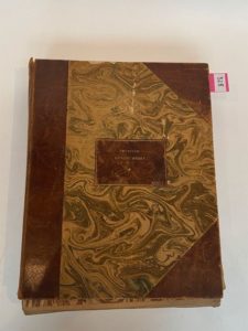 [DOCUMENTATION - MOBILIER] - Collection Marcel Bodet - Fort volume In-folio en feuilles composé de 47 fines planches de différents modèles de mobiliser d’intérieur dessinées et coloriées à l’aquarelle sur papier blanc contre collées sur papier fort teinté légendées Collection Marcel Bodet décorateur Brest - Quelques petites rousseurs mais coloris bien frais - Sous chemise à rabats demi-basane havane à coins (quelques frottements) - Pièce de titre basane au 1er plat - Marcel Bodet était tapissier-décorateur 2 place de la Tour-d’Auvergne à Brest, vraisemblablement dans les années 1940-1950.
