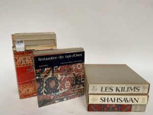 [DOCUMENTATION - TAPIS] - Ensemble de 6 volumes In-4° carrés : PETSOPOULOS (Yanni) - Les Kilims. Tapis tissés et brodés du Moyen-Orient - TANAVOLI (Parviz) - Shahsavan. Tapis et tissus de nomades persans - ITEN-MARITZ (J.) - Le tapis turc. Anatolie-Asie Mineure - GANS-RUEDIN (E.) - Le tapis du Caucase - DU MÊME - Le tapis de Chine - BÉHAR (Jacques) - Restauration des tapis d’Orient - Paris ; Vilo, Fribourg ; Office du Livre, 1979, 1985, 1976, 1986, 1981, 1985 - Très nombreuses illustrations photographiques in et hors texte - Reliures éditeur sous jaquettes couleurs, emboîtage (sauf 2) - Bon état.