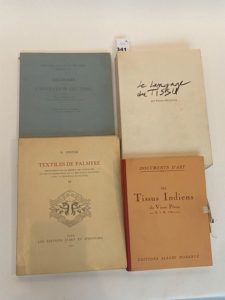 [DOCUMENTATION - TEXTILE] - Ensemble de 4 volumes : CHERBLANC (Émile) - Histoire générale du tissu. Document n°1. Mémoire sur l’invention du tissu - Paris ; Les Éditions d’Art et d’Histoire, 1935 - 1 volume In-4° broché sous couverture rempliée - 6 planches hors texte in fine - Très bon exemplaire - HUGUES (Patrice) - Le langage du tissu - Sans lieu ; Sans nom, 1982 - 1 fort volume In-4° broché - 137 planches en noir ou en couleurs hors texte - Bon exemplaire, l’1 des 2500 en édition originale - HARCOURT (R. et M. d’) - Les tissus indiens du vieux Pérou - Paris ; Éditions Albert Morancé, 1924 - 1 volume In-8° broché et 40 planches en feuilles au complet dont 34 en couleurs, le tout sous chemise éditeur demi-toile rouge à lacets - PFISTER (R.) - Textiles de Palmyre […]. Tome III - Paris ; Les Éditions d’Art et d’Histoire, 1940 - 1 volume In-4° - 18 planches hors texte dont couleurs - Bon exemplaire - Très bon ensemble.