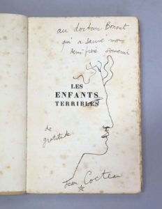COCTEAU (Jean) - Les enfants terribles. Roman - Paris ; Bernard Grasset, 1929 - 1 volume petit In-8° broché sous couverture rempliée (1 petite déchirure sans manque au 1er plat) - Des rousseurs éparses, plus prononcées en début et fin de volume - Exemplaire numéroté sur Alfa en édition originale du service de presse (CCXXIX sur les CCC) enrichi d’1 envoi autographe signé et d’1 dessin original de Jean Cocteau au faux titre : « Au docteur Bonnet qui a sauvé mon demi frère souvenir de gratitude. » - Ex-dono au stylo et cachet ex-libris à la 1ère garde blanche.