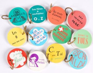 [ÉDITIONS ROBERT MOREL] - [COLLECTION LES O] - Sans lieu ; Robert Morel, [vers 1960] - Ensemble de 12 volumes ronds (6cm) reliés par 1 anneau en laiton et imprimés sur carton fin : Oscar Wilde, Ce toi sera 55 « pommes » - Les perles du libraire - Animaux et talismans - Les mots d’amour (lui à elle) - Je mange des fleurs - Les mots de Mao - O des petits Suisses - Les fêtes à souhaiter de 0 à 6 Les mots de Picasso - Le petit Rabelais - Histoires de fous - Bon état.