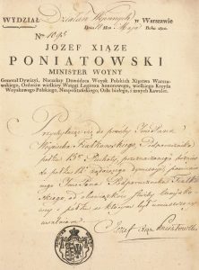 Joseph, prince Poniatowski (1763-1813) maréchal d’Empire. P.S., Varsovie 18 mai 1810 ; 1 page in-fol. à son en-tête Jozef Xiaze Poniatowski…, cachet encre Minister Woyny aux armes ; en polonais.