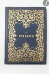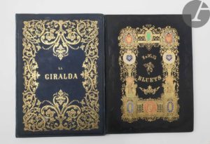 - LA GIRALDA. Peintres. E. Delacroix. Gavarni. Roberts. Watteau. Wille. Baron. Français. Diaz. Émile Perrin. A. Lemoine. Johnston. Frith. Van Vliet. Poëtes et conteurs. Shakespere (sic). - Lord Byron. Walter Scott. André Chénier. Victor Hugo. George Sand. Alfred de Vigny. Nodier. Millevoye. Mme Tastu. Lady Wortley Montague. Théophile Gautier. A. Toussenel. A. de Laborde. Mennechet. Matthison. Merville. Roger de Beauvoir et Henry Egmont. Paris : L. Curmer, [1845]. — In-4, percaline bleue à chevrons, riche plaque rocaille en encadrement sur les plats, dorée sur le premier et à froid sur le second, dos lisse muet, tranches dorées (cartonnage de l'éditeur).