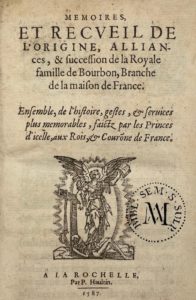 [BELLOY (Pierre de)] — Mémoires et recueil de l'origine, alliances, et succession de la royale famille de Bourbon, branche de la Maison de France.