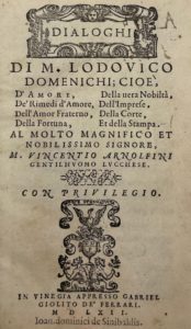 DOMENICHI (Lodovico) — Dialoghi, cioè d'Amore, della vera Nobilità, de' Rimedi d'Amore, dell' Imprese, dell' Amor Fraterno, della Corte, della Fortuna, et della Stampa.