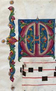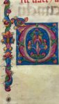 [Italie, fin du XVe siècle]. Initiales M et O à décor foliacé polychrome à rehauts d'or sur fond bleu (80 x 70 mm), bordées d'un rinceau. Enluminures découpées d'un antiphonaire. Minimes frottements au O.