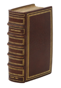Lyon, Guillaume Rouillé, 1561. In-16, maroquin brun, triple filet doré, dos orné, doublure de maroquin olive ornée d'une large bordure dorée, gardes de tabis pourpre, doubles gardes, tranches dorées (Blanchetière-Bretault).Édition lyonnaise d'une extrême rareté.