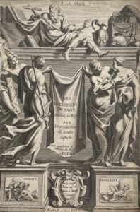 SÉBASTIEN DE SENLIS. Les Entretiens du Sage. Paris, Veuve Nicolas Buon, 1637. In-4, vélin souple (Reliure de l'époque). Édition originale très rare de ce traité de morale néo-stoïcienne du capucin Sébastien de Senlis (1621-1645). Elle est ornée d'un beau titre-frontispice gravé en taille-douce par Masne. De la bibliothèque de l'abbaye Saint-Wandrille, avec ex-libris manuscrit (p. 1). Reliure frotté et empoussiérée, corps d'ouvrage désolidarisé, un feuillet dérelié et plus court de marges (p. 183), pâles mouillures.