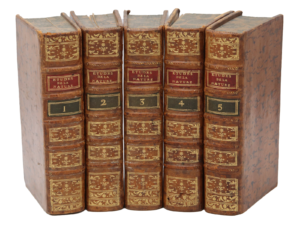1790-1792. 5 volumes in-12, veau marbré, dos orné, tranches marbrées (Reliure de l'époque).Exemplaire hétérogène, conformément à celui de la BnF que cite Toinet, avec les trois premiers tomes en date de 1791 (réimpression de la quatrième édition), le quatrième, qui contient Paul et Virginie, en date de 1790 (réimpression de la troisième édition) et le cinquième, en date de 1792 (réédition augmentée de La Chaumière indienne).