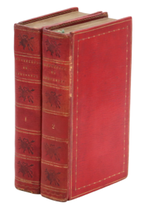 Amsterdam, Claude Jordan, 1709. 2 volumes in-12, maroquin rouge à long grain, roulettes perlée et pointillée en encadrement, dos lisse orné de filets dorés et fers spéciaux à froid, dentelle intérieure, gardes de moire verte, tranches dorées (Bozerian).Édition originale, en second tirage, de la traduction de Saint-Martin de Chassonville, augmentée de quatre nouvelles : L'Illustre Fregonne, L'Histoire de Ruis Dias, Le Mariage trompeur et Les Entretiens de Scipion et de Bergance.
