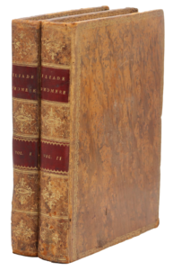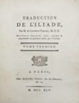Paris, Michel, 1795. 2 volumes in-4, veau raciné, guirlande dorée, dos lisse orné, dentelle intérieure, tranches dorées (Reliure de l'époque).Rare traduction de l'Iliade établie par L.-G.-R. Cordier de Launay de Valeri.
