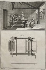 In-folio, broché, couverture de papier brun du XIXe siècle, tranches rouges. Suite complète en soi des 135 planches relatives à cette industrie, dont 23 dépliantes, dessinées par Goussier et gravées par Bénard pour l'Encyclopédie : apprêts de la soie, fabrication des étoffes en plein ou unies, des étoffes brochées, des velours, chinage, nœuds, calandre, etc. Elles sont accompagnées de 39 pp. d'explication imprimée.