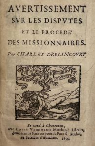 Avertissement sur les disputes et le procédé des missionnaires. Charenton, Louis Vendosme, 1654. In-8, vélin souple (Reliure de l'époque). Édition originale. Le pasteur Charles Drelincourt (1595-1669) exerça son ministère à Charenton de 1620 à sa mort. Rousseurs et petits travaux de ver. Taches et deux coins rongés à la reliure. Desgraves, II, n°5056.