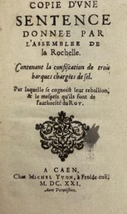 [LA ROCHELLE] — Copie d'une sentence donnée par l'Assemblée de La Rochelle, contenant la confiscation de trois barques chargées de sel, par laquelle se cognoist leur rebellion, et le mépris qu'ils font de l'authorité