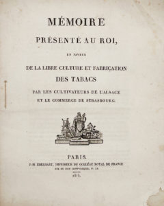 [TABAC] — Mémoire présenté au Roi, en faveur de la libre culture et fabrication des tabacs par les cultivateurs de l'Alsace et le commerce de Strasbourg.