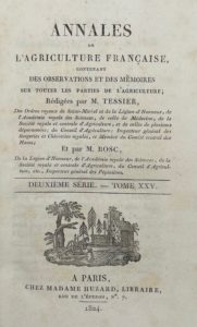 TESSIER et BOSC. Annales de l'agriculture française. Deuxième série. Tome XXV. Paris, Mme Huzard, 1824. In-8, demi-basane fauve, dos lisse fileté, tranches jaunes (Reliure de l'époque). Ce volume trimestriel, présenté seul, renferme de nombreuses contributions d'agronomie et d'économie rurale, parmi lesquelles De la meilleure méthode pour opérer économiquement la fermentation vineuse par Bigot de Morogues, aux pp. 5-56. Reliure un peu frottée.