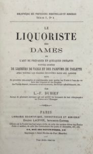 Le Liquoriste des dames. Paris, E. Lacroix, s.d. [1870]. In-18, bradel percaline verte estampée à froid, titre doré (Reliure de l’éditeur). Seconde édition parue dans la Bibliothèque des professions industrielles et agricoles de ce livre enseignant l'art de préparer en quelques instants toutes sortes de liqueurs de table et des parfums de toilette avec toutes les fleurs cultivées dans les jardins, suivi de procédés très-simples et expérimentés pour mettre les fruits à l’eau-de-vie, faire des liqueurs et des ratafias, des vins de dessert, mousseux et non mousseux, des sirops rafraîchissants, etc. Copieux catalogue de l’éditeur (96 pp.) en fin de volume. Quelques rousseurs, catalogue bruni. Vicaire, 288.