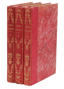 Paris, Ernest Bourdin & Cie, s.d. [1840]. 3 volumes grand in-8, demi-chagrin rouge, dos lisse orné en long de fers romantiques dorés, chiffre J. B. en queue, tête dorée (Reliure de l'époque).Premier tirage de cette belle illustration romantique, composée de 17 planches hors texte, dont 3 frontispices, et de près de mille vignettes dans le texte, gravées sur bois d'après Wattier, Laville, Demoraine et Marville.