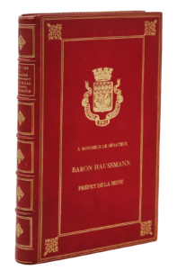 Exemplaire du baron Haussmann, somptueusement relié en maroquin rouge aux armes et devise de la ville de Paris, avec cet ex-dono en lettres dorées sur le premier plat : À Monsieur le Sénateur Baron Haussmann, Préfet de la Seine.