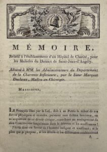 MARQUET DUCLAUX — Mémoire, relatif à l'établissement d'un hôpital de charité, pour les malades du district de Saint-Jean-d'Angély. S.l.n.d. – MARQUET (F.-R.). Considérations générales sur les effets que les altérations