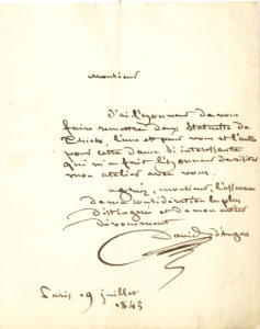 Pierre-Jean DAVID D’ANGERS (1788-1856). L.A.S., Paris 9 juillet 1843, à Auguste Léo ; 1 page in-4, adresse. Sur son buste de Ludwig Tieck. « J’ai l’honneur de vous faire remettre deux statuettes de Thick, l’une est pour vous et...