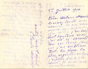 Il présente ses excuses d’avoir tardé à lui répondre : « j’ai été si dérouté tous ces temps passés que j’en oubliais tout, les choses les plus urgentes même. […] Je viens d’adresser à la Société générale de Meulan les 500f promis pour Mme Vignon. Ceci dit je suis heureux de vous annoncer la continuation du mieux dans l’état de notre chère malade [sa femme Alice]. Les forces reviennent chaque jour un peu moins vite qu’elle le voudrait, mais c’est plus qu’un progrès, c’est une véritable résurrection. Vous pensez si nous sommes tous heureux. Je vous adresse ces lignes à Paris, ne sachant pas où vous pouvez être avec cette vilaine coqueluche qui doit se passer vite avec le changement d’air ». Il lui souhaite une prompte guérison…