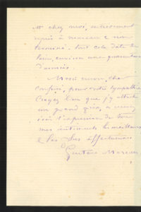 Gustave MOREAU (1826-1898). L.A.S., Évian 7 septembre 1895, à un confrère ; 2 pages in-8 (deuil). Il est « depuis cinq semaines à Évian, travaillant de mon mieux à me faire un hiver supportable. […] Voici les deux renseignements...