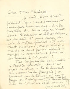 Kunstzaal Kleykamp à Amsterdam. […] tant de choses, tant d’événements se sont passés depuis le temps où nous avons fait connaissance à Munich !». Il doit aller à Berlin : « Si le souvenir d’un camarade français […] ne vous est pas trop désagréable (ungemuthlich), je serai bien heureux de vous serrer la main et de vous entendre – une fois encore – chanter Zwei Grenadieren »…
