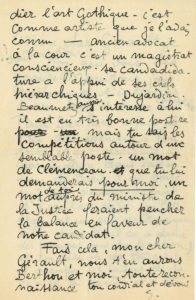 Crainquebille (il en a donné des preuves dans sa fonction) et un disciple de Bergeret, il occupe les loisirs de sa charge à peindre et à étudier l’art Gothique. C’est comme artiste que je l’avais connu – ancien avocat à la cour c’est un magistrat consciencieux. […] Un mot de Clemenceau que tu lui demanderais pour moi, un mot de toi auprès du ministre de la Justice feraient pencher la balance en faveur de notre candidat »…