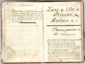 Claude-Henri WATELET (1718-1786). Manuscrit, L’Art de peindre, Poeme en quatre chants, [1740] ; 50 pages in-12, reliure demi-veau brun (usagée). Copie d’époque, portant au bas du titre le nom d’Eric de Ferrières., et un cachet encre des...
