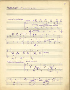 Le manuscrit, soigneusement noté à l’encre violette sur papier à 12 lignes, est daté en fin « Septembre 1914 Février 1915 ». Il présente des corrections par grattage, et quelques mesures biffées.