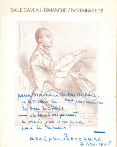 On joint un lot de programmes de Borchard et autres (Brailowsky, W. Rummel) ; plus des coupures de presse, la copie d’un texte de Carco, des documents iconographiques autour de Beethoven ; quelques gravures, et un dessin portant le cachet de l’Atelier Raoul Dufy.