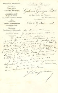 Jacques COPEAU (1879-1949). L.A.S, Paris 25 mai 1908, à Steinlen ; 1 page in-8 à en-tête des Galeries Georges Petit. Il fait le point sur les ventes de l’exposition de Steinlen : « 3 épreuves du N° 273 Sans gîte (dont une à l’Etat) ;...