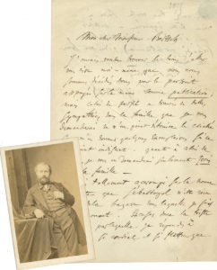 portrait appuyé sur la main comme publication ; mais celui de profil a trouvé de telles sympathies dans la famille que je vous demanderai de n’en point détruire le cliché sans m’en donner quelques exemplaires si ce n’est pas indiscret. Quant à celui de face, je vous en demanderai seulement trois pour la famille. Je suis tellement accroupi sur La Nonne sanglante que Sébastopol n’est rien auprès de la bagarre dans laquelle je suis en ce moment. Excusez donc la triste révérence par laquelle je réponds à l’accueil si cordial et si flatteur que vous avez bien voulu faire à ma tête ignorée »… On joint une photographie (Bayard & Bertall), format carte de visite.