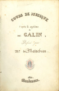 MUSIQUE. Manuscrit : Cours de musique d’après le système de Mr Galin, professé par Mr de MAINEBEAU, Bordeaux 1823 ; un vol. in-8 de 11 pages, reliure basane brune à grain long (rel. frottée, coins émoussés). Manuscrit de ce cours de...