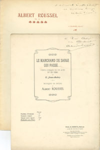 Albert ROUSSEL. 4 partitions imprimées avec dédicaces autographes signées à René ou Linette Chalupt ; in-fol. brochés (quelques légers défauts aux couvertures). Le Marchand de sable qui passe…, réduction pour piano (Paris, E. Demets,...