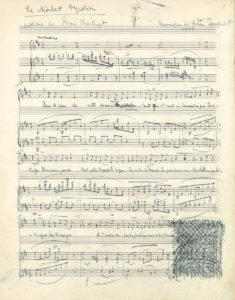 Le manuscrit, à l’encre noire sur papier à 16 lignes, est daté en fin « Coutras, septembre 1948 » ; il présente deux mesures biffées. Sur la page de titre, cette mélodie est dédiée « à Joseph Weterings ».