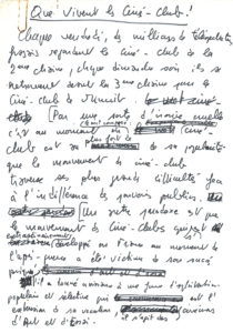 « le mouvement des ciné-clubs traverse ses plus grandes difficultés face à l’indifférence des pouvoirs publics ». Créé en France dans l’après-guerre, il « a été victime de son succès, puisqu’il a donné naissance à une forme d’exploitation populaire et sélective qui est l’extension de sa vocation, il s’agit des cinémas d’Art et d’Essai. » Faut-il dire « mission accomplie ? Certainement pas, car la naissance des jeunes cinémas nationaux, partout dans le monde dans la continuation d’esprit de la nouvelle vague française, a centuplé le nombre de films intéressants qui passent à travers les mailles du filet de l’exploitation courante ». Et les ciné-clubs se développent dans les pays du tiers monde ; c’est pourquoi est organisée une soirée le 30 mars à la Cinémathèque Française, sur le mouvement ciné-club en 1981 « ses difficultés, mais aussi sa volonté de survivre et de réaliser ses grandes espérances ».