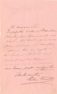 Pauline VIARDOT (1821-1910). L.A.S., à Monsieur Leni ; 1 page in-8, sur papier rose (montée sur carte). … Elle ne peut aller à Mannheim et décommande ses places « J’ai tant de choses à faire encore pour Weimar ! » Elle souhaite à...