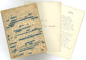 Le manuscrit, soigneusement écrit à l’encre noire sur papier vergé filigrané, présente quelques ratures et corrections, avec quelques poèmes à l’encre bleue ajoutés. Il a dû servir pour l’impression.