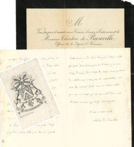 On joint l’ex-libris de Théodore de Banville, gravé par Emile Royer ; et son faire-part de décès.