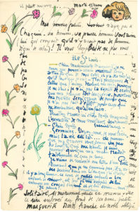 – Samedi. Il les remercie de leur lettre quoique Marguerite lui donne du « mossieu », et que Germaine montre une certaine distance « qui calme les battements de mon cœur, si bien que je me retrouve grelottant. Excusez ma franchise, elle vient d’un être qui ne demande qu’à aimer. […] se fermer c’est tuer dans l’œuf les gestes de fraternité ». – Mardi. Longue lettre illustrée d’une tête d’enfant et de fleurs colorées dans les marges : « Ce n’est pas rien de nous être rencontrés ! Un homme roué de coups par le destin rencontrant deux êtres charmants bons et nobles ! Un homme qui vous crie dans son amour : croyez au bonheur, il existe si nous le voulons ». Il s’adresse aux deux jeunes filles, dont il fait un touchant portrait : « Petite Germaine expressive et rieuse et généreuse obligée toute jeune de vivre solitaire, sinistrement seule et austère avec le rire enfoncé au fond de son âme. Petite Marguerite droite, franche et noble obligée de cacher la noblesse de son moi pour ne pas être traitée de pimbêche ou autre qualificatif aussi harmonieux que ridicule ». Il compte venir les voir et leur lire La Légende de St Julien l’Hospitalier de Flaubert « à haute et distincte voix. Riez, mais riez donc, mes chéries. C’est en cela que vous êtes jeunes et qu’un pauvre homme vous demande l’aumone d’un sourire et l’autorisation de regarder vos yeux pleins d’une rosée de larmes donnée par le rythme de trois âmes qui se sont retrouvées… Ouf ! Ce que l’on en a du mal pour distraire les petites filles quand on les a chagrinées »... – 12 décembre 1920, il dessine des colombes et des arbres battus par la pluie : « La Nature n’est tout comme les hommes dont elle fait corps, ni bonne ni mauvaise »... – Ile St Louis, avec dessin de fleur : « de penser que ma gravure vous donne un peu du souffle qui me hante, je suis heureux quoique ma main traduit faiblement ce que je sens »… – Vendredi matin 7h. Il est rentré de bon matin : « Le calme et la douceur de vivre descendait du ciel…Dans l’Ile St Louis ? Les arbres se caressaient en écoutant le rythme de l’eau […] Allons encore merci mes chères et délicates amies : je suis si peu habitué aux gestes tendres que lorsqu’il m’arrive de rencontrer ces fleurs rares, je me retrouve ivre comme un cosaque ! ». Il conclut sa lettre par un joli dessin de maternité. – 20 décembre 1920, sous forme de poème en prose intitulé Un ami : « Je pense à un ami. Son âme aussi-tôt marche devant moi… Ses yeux fixent mes yeux et son cœur bat dans mon cœur. […] Je pense à un ami : Le ciel devient plus lumineux. – Sa parole ? Je l’entends dans le murmure d’un feuillage et dans le son harmonieux du vent »…