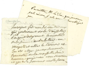 Sébastien Roch Nicolas CHAMFORT (1740-1794). 2 manuscrits autographes ; 1 page et demie et demi-page oblong in-16. Anecdotes. « Le regent fit un edit contre ceux qui garderoient de la vaisselle d’argent et promit la moitié de la somme au...