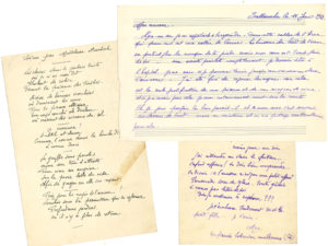 On joint une L.A.S. de Madeleine Auerbach à Max Bouligner (2 mars 1954) : « Premier jour en larmes du printemps. Mes cheveux ont accroché une nuée de perles. Je dégoutte lentement sur la table du café. Petit museau blanc des crocus, les primevères s’arrondissent toutes seules en bouquets de mariée, les pâquerettes encore fermées rougissent comme une jeune fille blonde de quinze ans et les pervenches ouvrent un œil bleu sur les rochers »… ; et un poème de Madeleine Auerbach recopié par Max Bouligner (2 p. in-8, 38 vers) : « Les chiens dans le palais triste / où je n’ai rien dit / Hurlent de colère »…