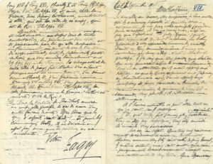 – 8 mars 1916. « il gèle abominablement ici et nous manquons de paille. – J’accomplis un tas de métiers invraisemblables ; je suis recrû de fatigue, j’ai des engelures, un panaris, les pieds meurtris, le rhume et la dysenterie, j’ai failli crever et je suis ravi. Je suis utile à quelque chose, et bientôt sans doute le serai-je davantage. Je me trouve précisément avec des artilleurs algériens : de rudes et beaux gars, de rudes et belles pièces. Ça crache, ça tonne, ça cogne »... – 26 mars. « Je viens de me déshabiller, pour la première fois depuis le 14 février, et même de me laver, de façon complète : certes, car il est écrit qu’il importe de débarbouiller non seulement son corps, mais son âme, et j’ai réussi à entendre la messe. […] Si bête que je sois, ou que vous pensiez que je sois (et peut-être le suis-je en effet, de persister dans cette controverse) je perçois votre ironie. Non, je ne me prends point pour un “héros”, et jamais je ne le donnai à entendre par rien. Nous ne sommes des héros ni l’un ni l’autre. Je fais tout de même mon devoir, heureux d’ailleurs de ne pouvoir faire mieux. Mais quoi, je porte, lourdement, mes 44 ans passés »...