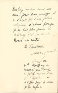 Max JACOB (1876-1944) L.A.S., à un ami ; 2 pages in-8. Il le prévient que Fernand Léger « est installé aux murs de Kahnweiler : ce renseignement peut te servir si tu as emporté tes Léger, car ça va monter. […] Kissling et moi avons...