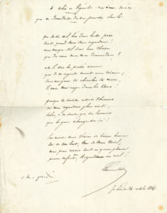 Alphonse de LAMARTINE. Poème autographe signé, À Alix de Vignet, ma nièce…, Saint-Point 24 octobre 1836 ; 1 page in-4 (marque de plis avec petite fente). Beau poème des Recueillements poétiques (1839).
