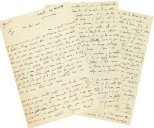 père : « Frappé mercredi soir d’une congestion cérébrale, que ses 86 ans rendaient d’avance sans espoir, mon pauvre père s’est éteint, sans douleur, tout doucement, hier au soir, 48 heures exactement après son attaque ». Il raconte la veillée, la tristesse, les sentiments qui l’assaillent, etc. Il veut toujours s’installer à Toulouse, et se consacrer à son travail : « Chasse finie, ou quasiment. Je ne chercherai plus, en terre française, que des sûres, c’est-à-dire qu’un sûr. Le décès de mon père me libère de ces appréhensions que je vous avais exprimées, mais je veux une année, au moins encore, être sans difficultés, pour mon roman [Les Amitiés particulières], qui […] peut être très bien ». C’est aussi cela qui l’éloigne de l’Afrique : « l’atmosphère de mon livre est essentiellement française et provinciale. Je me considèrerais comme un fou et un sot pour compromettre l’achèvement d’une œuvre qui me tient de plus en plus aux entrailles ». Le « pauvre Chev. » [le « Chevalier », Henry Houssaye], qui est en prison pour un scandale pédophile à Cusset, lui fait de la peine, et il tente de l’aider comme il peut, lui envoie des livres ; il va lui rendre bientôt visite à Cusset « pour lui lire mes papiers » [Les Amitiés particulières]... Ayant appris que les enfants de moins de 15 ans peuvent voyager librement entre les deux zones, il veut changer son programme et demande à Montherlant son avis : bien qu’il soit certain d’avoir un garçon sûr à Toulouse, il souhaite revenir à Paris : « je suis en délire à l’idée d’avoir, avec moi, à demeure, au lycée, une de mes deux sûres de Paris ». Il ne faut pas s’inquiéter des mères : « Il suffit de savoir présenter la pilule. Par le temps qui court, c’est quelque chose que de savoir en sûreté pour un an, et dans l’abondance qui est permise, sa petite fille ». Il pèse le pour et le contre, entre les trois garçons et les deux mères : que choisir ?... Il a un ami à l’Ambassade d’Allemagne : « Indication importante : si l’Ordre Nouveau s’établit [...] j’ai un homme à moi [...] à l’Ambassade d’Allemagne : Aschenbach, qui était le secrétaire de Welzeck et l’est, actuellement, d’Abetz [...] c’est le grand homme de la rue de Lille [Ambassade d’Allemagne] [...]. Bref, s’il fallait avoir recours à ces messieurs, en ma faveur [...] vous pourriez vous adresser là, sûr d’être favorablement accueilli à double titre »... Il lui demande de lui obtenir par cette voie un ausweiss, car on ne peut rien refuser à Montherlant : « vous êtes, là-bas, l’homme à qui l’on fait un pont d’or »... Il craint que la famille N. ne se sente jouée par eux, et que la Gestapo, malgré la protection d’Aschenbach, n’exerce un chantage : « Puisque ces messieurs de la gestapo savent tout [...] ils ne doivent pas ignorer que ces filles sont vos filles naturelles – et voilà le chantage qui commence »... Etc.