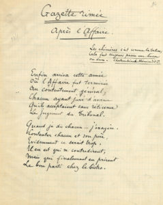 Raoul PONCHON. Manuscrit autographe signé, Gazette rimée. Après l’Affaire ; 4 pages in-4. Sur la concorde des Français après le verdict du procès Dreyfus.78 vers :